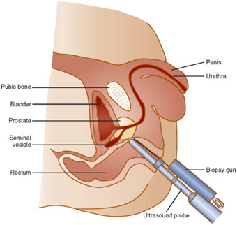 Биопсию называют «золотым стандартом» обследования и «истиной в последней инстанции». Биопсия простаты может выполняться под контролем пальца. Иначе этот способ называют «слепой» биопсией простаты. Исследуемый ложится на правый бок и поджимает к животу нижние конечности. Выполняется обезболивание прямой кишки с помощью специальных анестезирующих гелей. Пункционную иглу, под контролем пальца, аккуратно вводят в прямую кишку. Потом выполняются проколы – 4-6 из обеих долей простаты.